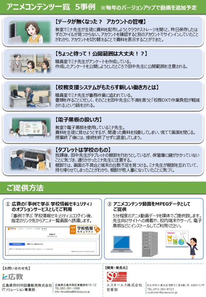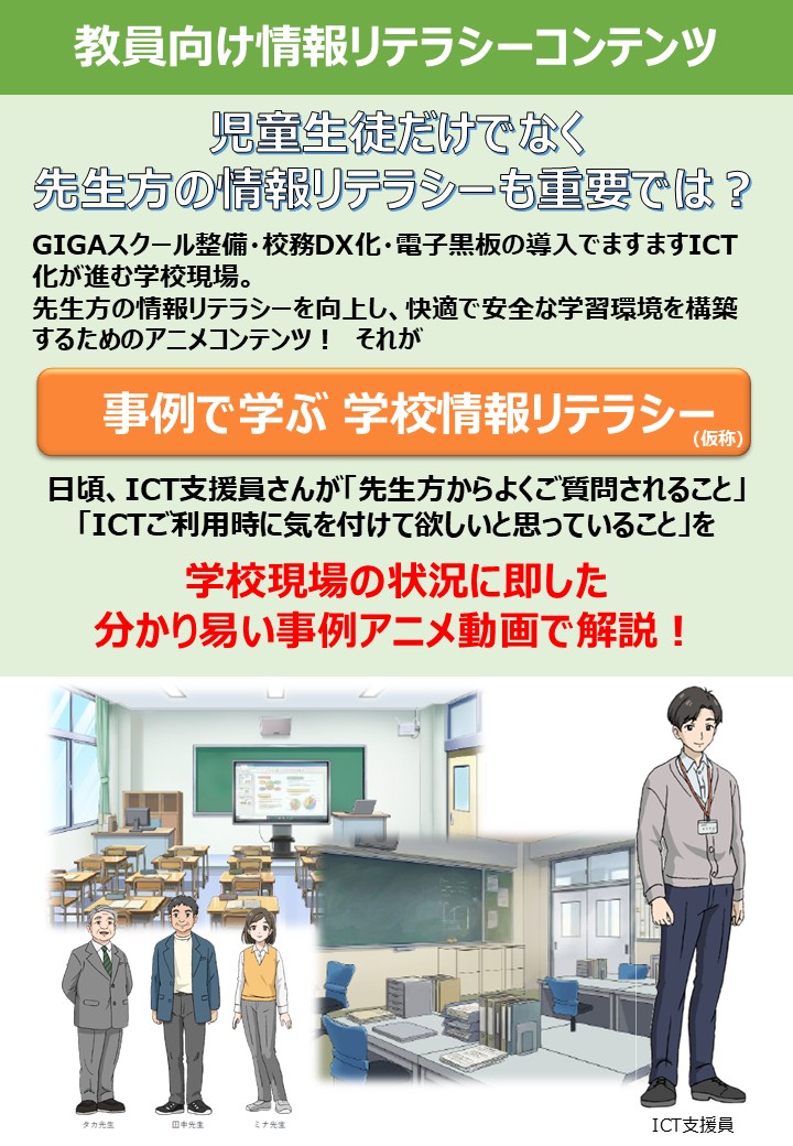 ドラマ仕立てのアニメーションとそれをサポートする各種資料で、情報教育が苦手な先生でもすぐに授業が行えます。